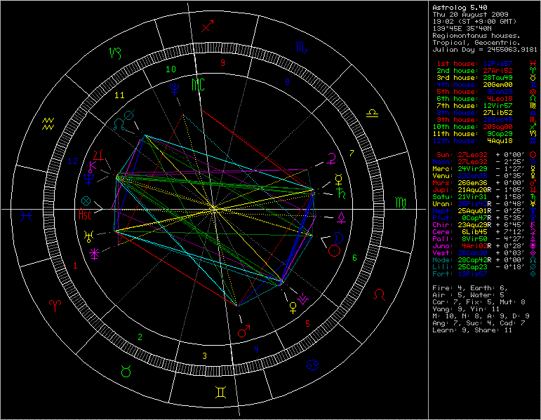 † 8/20新月図で星占いごっこ(1) †とにかく、私の場合、昔 占いの本を齧った程度で 今は疎遠になった いわば素人の趣味以下の人間。 私がどう言おうと 社会に影響を与えるとか 有り得ない人間ですし、 どうせ、ここは知名度底辺クラスの 閑散としたブログ。 だから、いまさら恥をかいても失うものも、占星術の信頼性への影響なども 初めッから無いですしね。ハズレが当たり前で 星占いゴッコでもしてみます。 今回の新月図は 8月20日からの約一ヶ月間に影響を与えます。 今回の新月図のテーマは「理想掲げる新たな政治の誕生、海底震源の大地震?」です。 大凶十字相 に 神の指 ・・・不穏な一ヶ月今回の新月図は、なかなか強烈な配置が見られますね。 重要な惑星を絡ませて グランドクロス(凶十字)もどき や ヨード (Y字相 別名 神の指)が出来ていています。 1H天王星,4H火星,7H水星・土星,10H冥王星の擬似グランドクロス。 どこから読み解せばいいのか、素人以下の私には 難解すぎる状態。 星の並びが とにかく不穏すぎる。混乱,激変,傷害,重圧。 政治関係日本に最も関わる星は、自国情勢1Hと政権10Hの共通表示星の木星。 12H水瓶座 にある木星には、1H支配性の海王星が一緒。キロンもあります。 理想論(海王星)を掲げる ふわふわと頼りなさげな(木星・海王星) 新鮮さのある(水瓶座)政権の誕生です。 なにしろ 1Hには、新しい時代を象徴する天王星ですから。 その政権の星に対して、新月(太陽・月)が真反対から ズドン!と突き刺さっています。 太陽は、官僚組織を担う6Hにある星。 これまで国を動かしてきたという自負心(獅子座)の省庁幹部(太陽)は、この頼りない理想主義者(海王星)をいぶかしげに見つめています。 また一般公務員(月)も、この新政権には 期待と困惑 不安感・警戒感をもってることが、星からも映し出されてます。 とくに厚生労働省(月)や総務省(獅子座・ほかに権力持つ財務省主計局や予算編成部署関係)などに根強い反抗心がありそう。そういえば、年金問題は厚生労働省でしたか。 政権交代による官僚組織の混乱とサボタージュ。(12H海王星・木星,6H月・太陽) その前にも駆け込み天下りがピークに達し、官僚から悪意のリーク情報で 政権に揺さぶりが掛けられる。(12Hは テロ・デマ・サボタージュなどの地下運動・隠れた不正行為) マスコミも 政権移行期の中、混乱状態の中からの豊富なネタの量に慌しくなり、検証や公正の欠けた記事に、政権は苦しめられる。 そして中立を装っているアメリカも 政権交代が現実化してみれば、相当な拒否反応を示してくるだろう。 (1H天王星は、7H土星・水星からオポ180度) 現状打開の日本(天王星)と、従来関係の維持を期待するアメリカ(乙女座 土星)の齟齬や摩擦が起きる。 これは 見方を変えると、1H=日本&天王星=核物質・核兵器, 7H=アメリカ&土星=約束・義務&水星=文書・条約・情報・・・となり、 まさに 核密約問題が象徴となって、神経を尖らせてくることになるかも。 でも、これには 蟹座の金星・ベスタが調停をしていて、アメリカの懸念は収まりそう。 言うまでも無く、野党(自民党)に 苦しめられる(11H管理星 土星とヨード)。 かつて野党自民党がやらかした審議拒否とか? 今、都議会を混乱させている自公の開会拒否のようなことを 国会でもやらかすのかな。 星と星座からして、健全な野党でもなく、あんまりカッコイイ野党には なりそうもない。 イジワル頑固ジジイのような感じ。 MC スクエア(90度)の土星と水星@乙女座からして、少数政党までが足を引っ張りそう。 与党が単独過半数に至らない苦しさか。 前半終わり~次項に続く この記事にコメントする