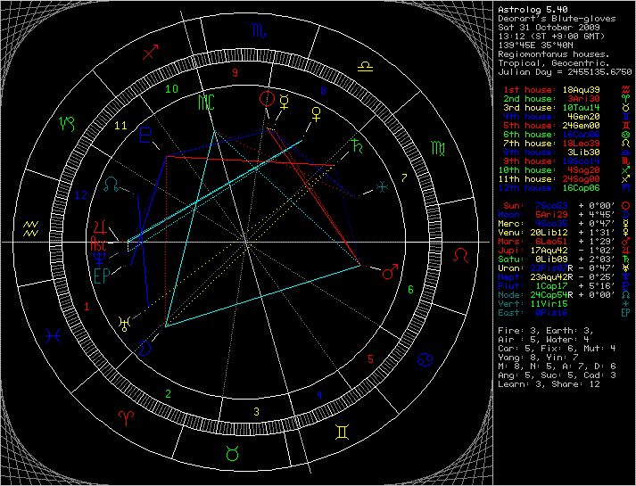 † 「猛獣グローブを買ったら?」を星占い †こういう占いは経験が無いので、私は明らかに力量不足かな。 でも、この頃は星占いネタも 無かったから ちょっとウズウズしていたし、これも遊びという感じで占ってみたよ。 星図が出来上がってみて あら びっくり。 希望の室の支配星となった木星が ASCにピッタリと乗ってる。 木星は 1H挟在宮支配星の海王星との合に向かっている木星は、 意外と長く使いそうな雰囲気でもあるけど、海王星だから しばしば紛失する運命かもな。 確かに手袋の類は 失くす危険がホントに高いからなぁ。紛失防止用にチェーンでも付けておくかな。 2Hカスプにある月が、火星とトライン作り、MCも絡んで、fieryなグランドトリン。ここの意味がよく判らないな。 6H支配星 月△火星。6Hは飼っている動物も表す。火星はゲーム性・闘争性の星、月も遊具とか表すし ネコも表す。 これって、飼っているネコがオモチャにしそうな表示じゃない。 グローブの管理には気を使わないと。 火星は 対人関係7Hにあるのと同質で、また評判や大衆を表す月。 自己主張や周囲への威圧の性格を持つ獅子座や 社会的ポイントのMCが絡んでいる。 このアイテムは 本人が思っている以上に 周りへのインパクトが大きいのかもしれない。 トラインなので 好意的親和的な評価で済むかな。 木星(手袋)と海王星(曖昧・イメージ)で、もしかしたら 買ってはみたものの 使わず終い・・・となる心配も。 そこで他からも検討してみる。 象徴星 木星 は 3H支配星と離反しているが、海王星が仲介している。 この海王星は難しいけど、1H挟在宮だから 本人の心変わりや 本人の環境の変化。それが魚座なので、寒冷、流動的、変化。 寒くなる朝夕や天候の変化に ポッと活躍するアイテムになるっぽい。 総体的副支配星となる月が牡羊座で厚遇されていて 7H獅子座火星や射手座MCと良い環境なので、それなりに外出に使われそうな気もする。 …ちょっと無理矢理な占いだったかな、やっぱり。 この記事にコメントする