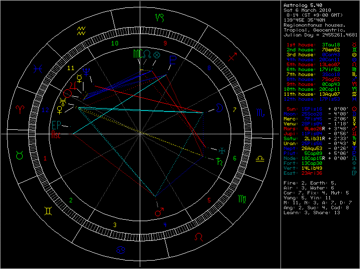 報道触発タイプのホラリーは有効なのか?今回は「テレビ報道を見て喚起された星図」であるため、 純粋な意味での ホラリー かどうか、検討が必要なものです。 私は これまで、他動による触発された星図は作らないようにしてきました。 なぜなら、議題が自然喚起された場合は ホラリーの共振性によるものと言えるものの、 こういう(オンデマンドではない一方方向の)放送報道の触発の場合、イベント的な性格が含まれる恐れがあるからです。 イベントとホラリーは相似してはいますが、同一ではありません。 そのため、イベントとホラリーの見分けが難しい場合、星図の性格が 扱いづらくなるため、私は敬遠してきました。 また、ホラリーだとしても、この場合、1Hが事件主体者(主に被害者)なのか、放送局なのか、悩ましいことがあります。今回は、この報道喚起型のチャートの参考資料として、敢えて 挑んでみました。 私はあくまで勉強中の身ですので、信頼性の問題につきましては 予め お断りしておきます。 追記(7日23時)・・・報道されている状況と、既に乖離していると思われる部分がありますが、これは報道されている記事に頼らずに 星図を読んでいるためです。誤りの可能性が高いですが、敢えて、修正はせずに残しておきます。 様々な角度から検討して、1Hを失踪した女子高生と規定しました。 ASCは、Sharatan と合。「傷害、敗北、破壊」の星。ま、これは参考まで。 ASC支配星は 金星で、12Hの魚座の 11H支配星 天王星と合。 高揚しており、月とのトライン。 本人は 現在のところ、無事でいるように思える。 岸壁にカバンが残されていたとのこと。 金星が老齢度数なので、落としたのか、本人が海へ呑まれたのか。 ただ、金星のディグニティが強く、本人は無事でいるのだから、カバンは遺失物ということなのかも。金星が終いの度数なのは、転落や滑落などを指しているのか?これは 何ともいえない。 天王星は 11h支配星なので、友人と一緒にいるのかもしれない。 今のところ、行方不明は 単独一名しか報道されていないけども。 金星は水星を嫌っている、これは将来に憂慮している表示。 火星を好いている、これは 誰か気の合う人がいることと、無意識な破壊衝動の表示だろう。 月は7Hで失墜。ラストセパレーションが、太陽とのトライン。 5hRであり、その5Hには、月のある7Hの支配星の火星がある。 男の子や友達と一緒に岸壁で遊んでいたのかもしれない。 月と金星はトラインだが、リジェクションである。 もしかして、両親と感情の行き違いがあるのだろうか。 ケンカというわけじゃなくて、気持ちが通じていないという感じ。 甘えたいのに甘えられないという甘えだろうか。 両親が どうしていいかわ判らず、この子を尊重しすぎるのかもしれない。 女子高生は 親を敬遠している。このままでは なかなか帰ってこれない 金星は 魚座12Hにあって、どこか出て来れない 出てこない決心の状況になっている。 もうすぐで、牡羊座に入り、インターセプテッドサインの星となり、損傷してしまう。。 このままでは 本格的な失踪になって、犯罪に巻き込まれかねず、本人に危険が及びかねない。 自力解決には、月とのトラインのファイナルアスペクトに望みをかけるしかない。 ただ、リジェクションを乗り越え、フェイスの関係を活用していかなくてはいけない。 これは なかなか厳しい条件かもしれない。 本人の金星と、両親の月のトラインには、天王星がコレクションしている様子が見える。 すなわち、この女子高生と一緒にいた誰かを捕まえて 居所を聞き出すことが近道になりそう。