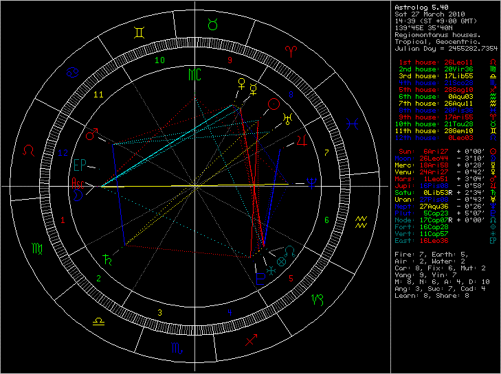 † 「今後の鳩山政権」 †今回、あくまでホラリーからの考察なので、社会占星学(マンデン)の会合チャートのようなハウス管轄とは区別しなくてはいけないことを意識しつつ。 今、沖縄基地問題や郵政規制緩和、政治資金不正問題などで迷走している この鳩山政権、今後どうなるんだろう?と思って 参議院選挙も視野に入れたところで、ご宣託を伺ってみた。 占星学の練習生みたいなものなので、お遊びの おみくじ 程度で見て欲しいです。 私ごときのものは、占星術が当たる当たらない以前のレベルなので。 ASCに月が僅差で乗っている。ラディカリティは有ると見て良い。 12H支配星 月があって、古典的ヴォイドのペリグリンにあって、海王星との接近相。 政権のテーマや目標が設定できず、周辺は まとまらないまま グダグダ状態。 足の引っ張り合いになってしまって、政権の支持基盤が脆弱化している・・・という現在の状況を表示している様子。 海王星は 8H支配星。 ん~と、政権にとっての8Hとは何だろうか? 国家チャートなら 債権とか 外国の経済の管轄だけど、 ホラリーの場合は政権にとって、8Hは何を意味するのだろう? トランスサタニアンだから、あまり神経を尖らせる必要も無いかもしれないけど。 それよりも、まずは 7Hが認定しておかないと。 まず政権与党に対してなら 野党、日本国に対してなら 外交相手国、 被選挙権者としてなら 選挙民(国民有権者)となるよね。 今回は それら全てを指す可能性があると思う。 政権の重要表示星 月が、混乱して 支持を失って 液状化を起こしている。 政権の迷走は 今後も続き、外交相手国の信頼を失う。 支持率はこれ以上の下落は無さそうだが、低迷状態が続く。 太陽が8Hにあるが、アスペクトを作れそうな星は 皆 サインを逃避してしまうし、追いかけても来ない。 まるで 裸の王様 である。太陽の権力はあるが、成果が出ない。 9Hカスプ(審判)に、太陽が接近している。 太陽は火星とミューチュアルレセプションで分離のトライン。 これは 今年の参議院選挙を表していると思われる。 9Hが選挙というのはオカシイという見方も起きるかもしれないが、 火星は 政権の基盤 すなわち 4H国民有権者 の支配星でもあり、 本来 戦いの星である。 私は、この場合の火星は 選挙の表示だと思う。 太陽は 議会・与党の 11H支配星に向かっているが、水星は逃避による解除を起こす。 支持低迷の鳩山首相とは係わり合いにはなりたくない。 ただ、水星は太陽を強く意識していて、海王星との仲介を果たそうとしている(だが海王星は太陽を拒絶している)。 民主党の議員達は、なんとか政権の失態を取り繕ったり、理解を得ようと説明をする。 しかし、それはなかなか理解を得られない。国会対策も上手くいかず 議会運営もスムーズに行かないようだ。 しかし、太陽と火星の トラインの余韻が残る調和的なMRは、光っている。 太陽の8Hは 非常に悪い状況の位置だが、ASCからの火星の支援は強力。 これが与党の強さなのだろうか。 7Hの海王星。 国民は政党への信頼を失って 投票先に戸惑う。 野党の自民党や公明党も 混迷迷走を続けるからだ。 7H支配星 土星はディグニティは強いが、 太陽とのオポジションの影響が大きい。 土星は逆行のまま 何もせずに そのサインから逃避してしまう。 土星のディスポジターでもあり、支持基盤の支配星 金星は、 ディグニティが悪く さらにヴォイドになっている。 対抗相手の党は、選挙のテーマ 掲げる政策がまとまらず、まともに戦う体制に出来ない。 過去に囚われ、立ち向かえず、未来志向になれない。 鳩山政権は 結局 生き残り、選挙は与党有利 勝利になりそうだ。 追記修正(28日23時)ヴォイドのときに占うってのは過ちが多くなるものです。 改めて星図を眺めて、思ったこと。 月がペリグリンのヴォイド、12Hカスプ 火星と 8Hの太陽のMRは、 本当に 鳩山政権 の存続を意味するのか、疑問は残る。 星の勢力を見ると、政権を支える勢力は衰えを見せ、政権は政治の舞台から排出されるように見える。 でも、選挙では 与党の優勢になるという見方は変わりは無い。 私は 名誉有る(間での)撤退 すなわち 自ら総辞職でもやりそうな気がする。 (4/11追記説明・・・ 政権の支配星 太陽は8Hで孤立、その無力の王様を 加護している牡羊座サイン末端にいたり寿命を終えるのだけども、 それを火星が救出する。救出はするが、12Hのカスプにある星であるので、権力を喪失し 隠居の状態になる。 例えるならば、 王政が崩壊するときに、王族が第三国に亡命するようなことを想像してもらえるといいかも。) ASCは終末的度数、月から余命3~4ヶ月とも読める。 ASC支配星 ヴォイドの太陽が MR庇護下のサインの終端までが24週間 (8H支配星 海王星とのファイナルアスペクトとするなら、21週間) と読めるとすれば、4~5ヶ月。 すなわち 今年の7月~9月頃、内閣総辞職 もしくは 政権が刷新されるのかもしれない。 中間検証(1)(4/26)鳩山政権は迷走を続けている。国