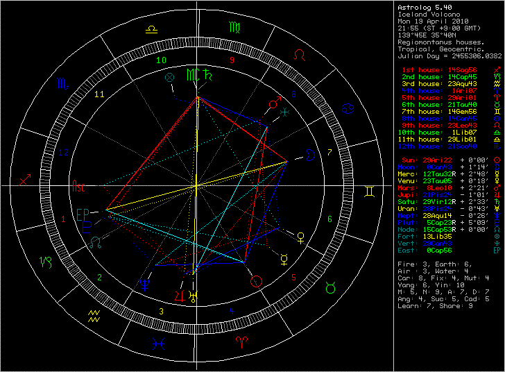 † 「アイスランドの火山活動」 ホラリーで・・? †本来は アイスランドの国家チャートとか 四季図(イングレスマップ)や月相図(ルナーマップ)などを用いて、 社会占星学で読むべき議題かもしれません。 でもホラリーの練習として 見てみました。 経験と研究心が何より大事ということで。 昨夜に書き上げていたのだけど、そのときはヴォイドだったので、用心をして 一応 今日に更新することに。 今回の議題は「この火山噴火はいつまで続くのか?」、 そして副次的に「この影響はどうなるか?」です。 あくまで 占星学の初級者の練習なので、ご注意を。 アイスランドの噴火活動は いつまでか? そして その影響は?月は 若い度数で ノーアスペクト・・・「君は 占うには まだまだ ヒヨッコでしょ?」と笑われているような一時的ヴォイドです。 ・・・ま、何事も勉強ということで。 ASCが射手座。 時間支配星が微妙なところですが 一応は木星で、ASC支配星と合致。 ん~、でも、上昇室は 質問者の私なのか、火山なのか? こんなケースは学んだことが無いので、自分で考えるしかないか。 1Hは カレントの私、これは決まり。 そこで考察しなければいけないのが、 海外の火山活動が どのハウスに管轄されているのか・・・ということ。 海外問題ということで 9H という見方も出来ます。 また 大地の活動を占うという意味では、4H という見方も出来ます。 どちらも火のサインであり、迷っていたのですが・・・。 ここで、面白いことが起きています。 なんと、4H支配星と 9H支配星が、ミューチュアル=レセプションを起こしてるのです! つまり、このホロスコープは「海外の大地の活動について語りましょうか」という 星の神様の ありがたい御言葉のようなチャートです。 いやはや、、、、こんなことがあるんですね。 しかも ASCは 海外を表示する射手座でもあります、なんというチャートでしょうか。 ただ、残念ながら、私には せっかくのご宣託を 聞き取る才覚が足らないんですけど・・・。 私は 4Hから見ていきます。火山活動そのものを知りたいからです。 火星は、South Asellus という星と一緒にあります。 これはVulcan(火と鍛冶の神)に関係した星で、太陽と火星の属性を持ちます。 獅子座のここに火星が来て、火山活動が活発化というのは、 もしかしたら 何か意味深長な位置です。 この星は、「Public disfavour (社会的に嫌がられること)」「misapplied power(誤った方向への力)」というのだから、 マグマが間違って 噴き出てしまって、世界から疎ましく見られる火山活動・・・なるほどね。 英語がよく判らないけども、この恒星は 「蟹座の肛門」らしくて、そこに火星・・・・ これなどは、カニが下痢して ピーピーとお腹を下しているイメージが 火山活動に重なるのですが、どうでしょうか?(笑) こういうこと書くと、サビアン派と間違われそうですね。 4H支配星 火星は 海外の9Hのサインにあって、8Hの中。 水星とのスクエアがあり、それは逆行している。他にイージーなアスペクトが無い。 度数からして4年・・・今後 4年間・・・4年後、そういう影響が出てくるのでしょうか。 7Hは 大地活動の結果の室でもあり、火星は 大地活動の死の室にあたるので、 この火山活動は4年間続くのかも。 太陽は もうサインの終末にある。ここからすると、火山活動があまり長期化しないとも読めることもないが、 私としては やっぱり前述の4年かな?と思う。太陽の位置だと、1ヶ月程度で終息するということになる。 その中で活発な活動は ひとまず一ヶ月間ということか。 月は 蟹座0度。オウンサインながら、度数が若すぎる。 8Hは、、、よく判らないけども、7Hは漠然とした一般の人々を意味していて、 そこから社会経済への影響を月が示していると思う。 月はアスペクトを持てない状態。作るにしても 逆行の水星。でも この水星は 月に 可愛がられる(高揚の歓待)し、火星に傷つけられる前に繋がる。 ドラゴンテイルがあるから、手放しで喜ばしいとまではいかないか。 ここからすると、農業などに経済的打撃は 最悪な状況は回避できるが、悪影響は出ることは否めない ということか。 では、心配されている航空関係、これはどこになるんだろう。 まず、7H+9H=3H とみるか、9Hとみるか。 そこで、ICで自己主張している天王星が気にかかる。 まさしく航空機の象徴星だし、3Hには水瓶座がある。 ここから、今回は3Hを航空関係と見なすことにした。 おそらく、3Hが海外の航空機、9Hが日本の航空機になると思う。 天王星は 魚座の終端近くにある。そしてMCの土星のオポジションに向かう。 3Hサインと9Hサインの末端でのオポジション。 心配なのが、航空機の墜落事故。海や湖への墜落、そして 都市部への墜落の心配。 航空業界は 運行休止措置に悲鳴を上げて、再開を働きかけているといわれますが(記事更新の本日、再開されている?) やはり噴煙粉塵による事故は起きる危険があるのかもしれない。 ただ、だからといって このまま 欧州