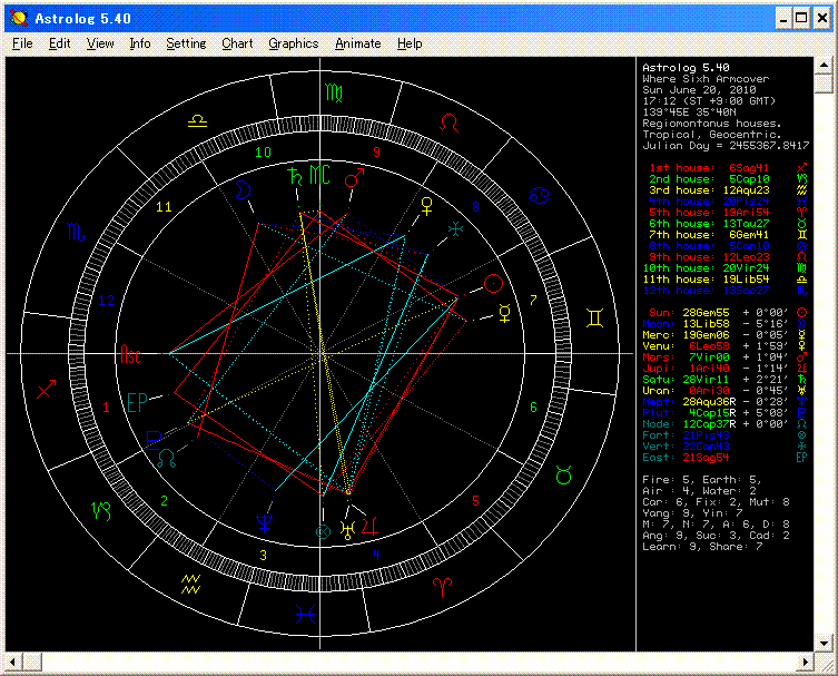 † 占星術で遂にアームカバー見っけ! †今回は、インスタントヌードルのように、簡単に星図を診た雑な例だけども、簡単に見つかった例。 限られた範囲だったとはいえ、そこは今まで 幾度も探していたのに、見つからなかった場所だったので、 それなりに星占いが役にたった。 夏用に使いたかったSixhのアームカバーが行方不明で、ずっと探していたんだけど、これまで見つからなかった。 この日、Sixhの買ったばかりの服を収納しようとしたときに、 「もいっかい アームウォーマー探してみるか」と思い立つ。 けども、もう目ぼしい場所は探し尽くしたし、同じように探しても見つかるかどうか・・・。 そこで、これは占星術を参考にしよう発起し、ホラリーチャート作成。 経験上、これは結晶化している質問なので、星図の有効性検討せずとも 有効性有りを決め付けた。 ここからは、事後的に解説している部分がありますが、今回 とにかく大雑把に見ています。 ざっと見たところ、まず月がアングルで、水星をトラインでアプライのファーストコンタクト。 ディスポジターが 月→金星→太陽→水星(アングル)。これは 見つかりそうかも。 サインからすると、月の天秤座で、やはり Sixhなどのオシャレな服のところにありそう。 獅子座で 壁際、側面。水星は 収納されている中。 ただ、月がペリグリンで、アングルとはいえ、11H サイン中なので、これだけでは決められない。 もう一つ、2H 土星。黒地の布で出来ているので、妥当性あり。 それが 10Hアングルで、乙女座の末端。これはやはり、収納されている場所、とくに 低い場所とか。 土星は ヴォイド。海王星とのファイナルアスペクトを認めるとしても、海王星が4H支配星なので、見つかる見込みあり。 6/26訂正:海王星とはメジャーアスペクトを作っていませんね、私の見誤りです。とにかく今回は、ほんと雑な見方してますね・・・。 方角は西か南を疑ったが、今回は方角は必要じゃないので、あまり検討しない。 今いる部屋の 東側。Sixh などの服を収納している床置きのクリアボックスが怪しいと判断。 とにかく入っている服を幾つもずるずる引っ張り出してみたが、アームカバー見つからず。服にまぎれて 入っていると睨んでいるが、見つからない。 「いや、星図は 絶対にここを指し示している!」と 今回は しつこく探してみた。