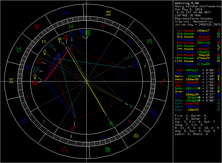 今回は、無関係の人間による発起により起こされた星図です。 C.A.などのテキストでは カウンセリング(依頼)が前提で書かれているので、 今回のように 第三者の質問の場合は、ちょとだけ応用と確認をしなくてはいけませんね。 さて、ASCの主が誰となるかについて、男性側か女性側かについて。 無関係者の質問提起者となる私は、女性側を念頭にしていましたし、 また、星図でも ASCに金星が乗っており、これは女性 Aさんと見ていいです。 当然、対称室の7Hが 男性側 Tさんとなります。 結婚を観る際の定石に従うと、 ●女性Aの結婚象徴星は、ASC上の金星(月と離別)、ASC支配星 水星、月。 ◆男性Tは、DES支配星 木星、男性象徴星の太陽(月と接近)。 なお、月に関しては、今回の傍観者星図でも、一応 女性の象徴星と見ていいと思いますが、別の役割を持つ可能性には注意しておきます。 女性Aを表示する月や金星は 男性Tを表示する太陽に向けて、セクスタイルに進行。 ここが結婚に向かう表示なのでしょうか。 しかも月は太陽を歓迎しているし、月もそれで牡牛座の好影響が流れ込んでいる。 強い惹かれ合いですね。 太陽が野生状態から捕獲された状態なので、女性Aの方が腹を括った感じなのでしょう。 なにしろ、ASCに乗っているのが、5H支配星の金星ですから、 恋愛の意味合いが強い星図です。 しかもASC支配星の 水星と、ミューチュアルリセプションになっています。 気に成るとすれば、まず 5Hカスプの逆行無品位の土星。 MCに乗った海王星と、11Hが魚座で月・木星・天王星という並び。 そして、関連する箇所がサインが軽い傾向。 女性Aさんが、この男性を どのように御していくのか、 手腕の見せ所なんでしょうね。 ASC支配星の12Hでの逆行、金星のペリグリン(ただしMRあり)、MCの海王星のあたりは、 タレント活動無期限休止の関係表示でしょう。 月が 10H支配星 乙女座 土星とアスペクトするときに、入籍となったようです。 星の距離から時期としては 5月9日から 11週間後あたり、7月25日前後の週ということです。数日 ずれてますが、まぁ、2ヶ月以上先の予測の数日差(1割程度)なら 誤差の範囲でしょう。 この記事にコメントする
