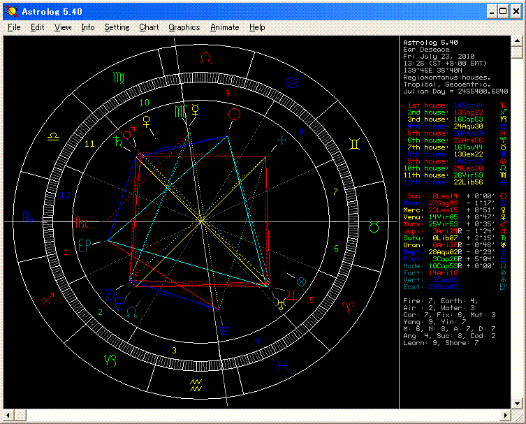 † 「D」の世界を勉強しようかな †歴史の古い星占いには、当然のことながら「病気・治療法」を占う技法も存在します。 漠然とした「健康運」ではなくて、目の前の病人の 今 患っている病気についてを占うって技法です。 ただ、これは現代社会の規範として、現在では一般的には禁じ手でもあります。 判りやすく言うと、「医者じゃないのに、診断・治療を行なうこと」は やってはいけないことです。 なので、個人的に占うことは出来ても、病名の告知とか医薬品の処方などは、禁じられています。 当然、私も 占うこと自体は出来ても、「私が占った結果、あなたは これこれという病気で、この薬を飲みなさい」とまでは 決して言ってはいけないのです。 ・・・とまぁ、こういう前置きをしまして。 この金曜日に、職場で聞いた 或る女性の娘さんが、難聴やら何やら 病気が度重なっているとのことでした。 念のために書いておくと、向こうは、私が星占いを勉強していることは知らないです。 世間話の上で「どうしたらいいかなぁ?」と聞かれた段階です。 先に述べた通り、「私が占った結果は・・」とも病名も言えませんが。 このチャートを読むべく、しばらくの間、病気鑑定に関するものを勉強してみるつもりです。 この記事にコメントする