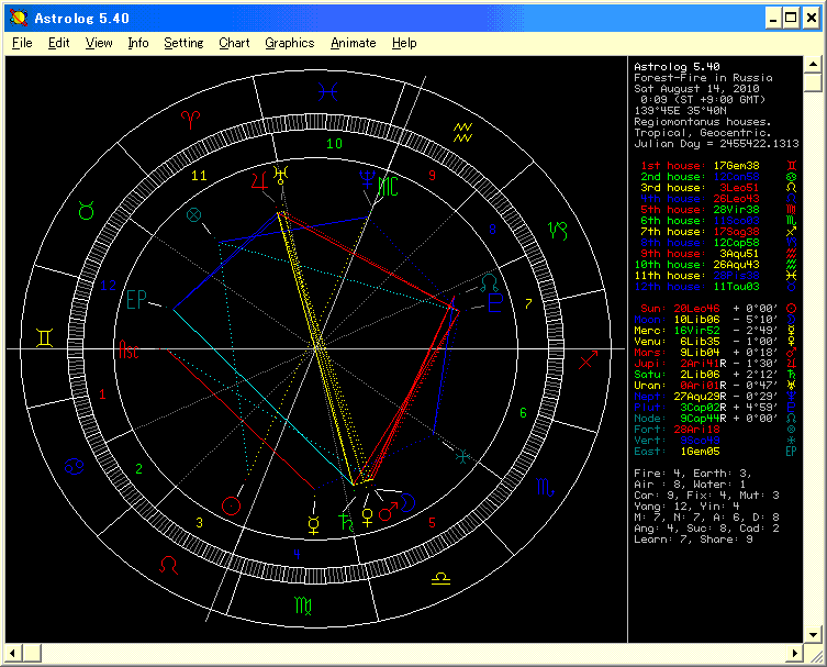 † 『ロシア森林火災の終息は?』 †「ロシアの森林火災」が まだ続いていますね。「ロシア全土を焼きつくす勢いの山火事」とまで言われています。 今回も 本来は マンデン(社会占星学)で見るべきところを、 敢えて勉強のために ホラリー(時事占星学)で見てみました。 素人の勉強ということで 本来は じっくり見たいところでしたが、 あとで修正追記を入れるかもしれません。 付記・・・「森林火災」を占うとなってますが、ここには「旱魃」も含まれています。原稿を書くとき、併記し損ねました・・・。 ≪現在の状況≫質問は「ロシアの森林火災が今後どうなるか」です。 ロシア大統領から穀物輸出禁止措置が出たこともあり、世界の食糧事情のことも憂慮しています。 時間支配星は金星。双子座とは属性で一致しており、月と 合。 そして 他にも 有効性を主張しており、それなりにラディカリティを有する星図の様子。 そして、ちょっと不可解なことになってます。 森林火災のチャートなのに、「火」ではなく「水」の星である海王星が主張しています。 外国9Hと相手国10Hの支配星が土星で、火星が離れつつあるところ。 悪質な品位の火星が、ロシア国土(10H)を焼き払い、 収穫(12H)の金星を焼き尽くしているところ。 収穫の金星は品位は強いが、Besiegingに陥っており、火星に接近している。 国土の土星や農地の金星の品位は高く、今はまだ森林や穀物への被害は少ないと思う。しかし金星は火星に接近しており、 これから農地が被害を増すかもしれない。 輸出禁止処置は冥王星のスクエアによるもののように見える。 大統領が政治経済で権力掌握するために、先手を打って、穀物を道具にした 輸出禁止処置かもしれない。 ≪いつ どのように 終息するのか≫火星と別れた月は、ここから太陽と出会うまで ノーアスペクト(一種のヴォイド)になり、Peregrineとなり、 しかも ViaCombusta領域に突入する。 これは これまでと比べれば 火の勢いは落ちるが、散発的に 火災が続いていくことを表していると思う。 森林火災のコントロールが利かない状態で、続いていく。 月は 焦土の歩みのあと、火星の色を残しつつ 太陽とのセクスタイルになる。 月は野生化しており、太陽はドミサイルながら 天秤座と折り合いが悪い。 森林草原は、火事に強い森林や土地が残るという感じなのかな? 森林火災の延焼が落ち着く時期としては、 これから10週間後の10月上旬のころ、焼き尽くしたところで 小康状態となるのではないか。 そのあと、月と海王星とのトラインが出来る。これが火事の終息を意味していそうだ。 4ヵ月後(17週後)となる12月(上旬頃)に、寒風や降雪などによって無事 鎮火するという、 結局は「大自然の大火事を大自然が鎮火する」というになるのかもしれない。 追記(8/15)・・・(これは「鎮火の時期」よりも 「大気汚染が沈静化する時期」 を指すように思う。詳しくは下の追記参照) ≪MCに海王星の意味は?≫ただ、この海王星は 本来は そういう意味でMCに出てきているわけではないと思う。 火災の星図でありながら わざわざ水の星である海王星が出てきた以上、この星図で留意すべき星だと思う。ただ残念ながら、私の今の能力では、すぐに答えが見つからない。 「期限無き 自然終息」という意味だろうか、それとも「(ロシア経済の)混乱・インフレ」だろうか。 それとも この火災の頻発は 実は「テロ」だったりするのか・・・。 ≪追記≫ 海王星は「大気汚染」の象徴だった![08/15]なぜ 火災の星図で海王星なのか?・・と疑問に思っていたが、 ニュースで このロシアの火災問題を見て、すぐに理解した。 海王星は「不透明」「ガス」「化学石油物質」の星でもある。 そして今、ロシアでの猛暑が、森林火災だけでなく泥炭の火災なども引き起こし、首都にまで スモッグ的な大気汚染が発生して、国家的な問題になっている。 すなわち、星図で 海王星が、火災による大気汚染を描写していたのだ。星図は、 森林火災よりも 大気汚染の方を 注目しているのかもしれない。 恥ずかしながら 私は、 ロシアで深刻な大気汚染を引き起こしていることを認識していなかった。