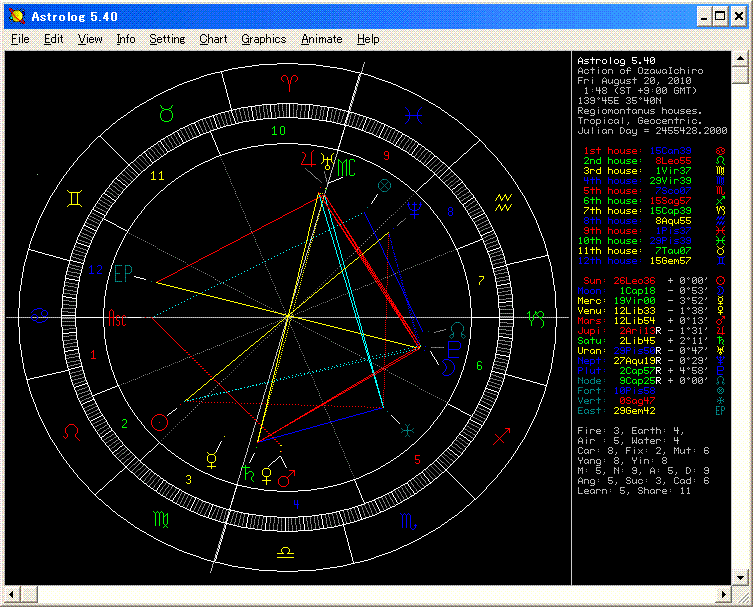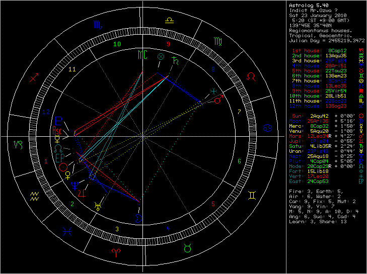 このときの星図で、第7室 検察を表示する月は ヴォイドとなり、検察の希望を表す金星もコンバストとなって、 本星の贈収賄罪での立件が挫折することが予想されました。 しかし、4H支配星 火星が、9H支配星 金星と、2H-8Hでオポジション。 最終的に土地問題で起訴されるとは予想していました。 現実には、小沢氏は、検察によって幾度も 不起訴処分とされ、さらに第3検察審査会でも 2度の不起訴不当→不起訴処分となっておりました。 だから、もう起訴は無いものだと思い込んでいました。 しかし第5検察審査会から2度目の起訴相当処分による強制起訴へと決まりました。 「贈収賄では起訴は断念、土地関連で起訴」という予測は ズバリ的中しましたが、 まさか数ヶ月を経ての 検察審査会による強制起訴という答えまでは 思い至りませんでした。 この成り行き、検察審査会という存在を、ASCから どこで起訴されることが表示されているのか、正直 よく判りません。 これは 今後 考えたいと思っています。 小沢氏関連では、もう一つ、『Mr.Ozzyはどう動くか?』という民主党党首選が間近になったときの 以後の小沢氏を予想しています。 このときの予測のうち「立候補しない」「小沢派女性が入閣」は外れました。 ただ、実際に立候補して、数の上で楽勝とも見込まれていた小沢氏ですが、 星図(星の勢い)では 菅直人氏側が大きく有利であったし、勝つのは菅直人側だと予想できました。 このとき これは 9H旧支配星 木星が逆行して、月とスクエアになることで示されています。 これが9月中旬を示していて、検察審査会で 小沢氏が不利な状況になることを示しています。 それが10月のこの時期の発表とは。 この審査会の発表の遅れを どこが示しているか、まだ 判りません。 もしかしたら、木星とMCの合が それを表しているのかもしれません。 さて、裁判の結果については、やろうとすれば占うこと それ自体は出来るし、そうでなくても この2枚の星図で 或る程度の答えが出ています。 ただ、それは割愛させていただきたいと思います。 この記事にコメントする