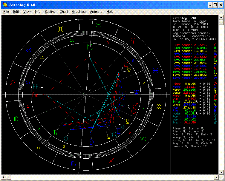 † 【占星】エジプト騒乱 †今、チュニジアの政変から北アフリカアラブ各国へ波及している中、 エジプトが騒乱状態になっているとのこと。これを書いている途中に、内閣総辞職というニュースも来た。 土曜日に 勢いで星図を立ち上げたのですが、 占星として 時機が収斂しきれていない時だったかもしれません。 率直に言って、星図がどこまで有効性をもっているか、疑心暗鬼です。 っていうか、星図を読み間違っているような気もする。 いまいちスッキリしてない。間違いを起こすのを怖がっていては勉強できないですよね。。だから「わたしは占星術勉強中の素人ですから・・・」と先に言い訳しておきますよん。 金星の日の、太陽の時刻の星図。 ASC支配星と 時間支配星が同一なので、ラディカリティが基本的には有るということのようですが・・・。 ASC支配星がアングルで月とアプリケーションでもあり、DESに海王星も乗っている。 1Hがエジプト国家および政府、今回は反政府活動なので7Hも注視する。 その7Hに、国土国民の4H支配星 熱狂・放火・暴力の火星が入っている。 DESの海王星が 国内の不安定状態を象徴していて、 ムバラク大統領 ASC支配星が7H内にあって損害の位置で、火星と合。 民衆の暴力行動 火星はコンバストなので、本来は 政府側が強いはずなのだが、 太陽がデトリメントなので、軍や治安部隊が出たものの、微妙な力関係となっている。 7H側の主支配星 土星は 逆行で高揚。威勢が強く 騒乱状態。 だが、レトログレイド&キャデントで、有効性が弱い。 土星は軍隊・治安部隊の6H支配星でもあり、情勢の行方を見守っている。 悪く言うと、治安部隊が高みの見物をしている。 主役であり 民衆の星である月が、木星から太陽に働きかけている。 7+2H 景気物価の問題と国の将来に夢を見ている。7+11Hは、法治国家らしい民主国家を望んでいる。 木星は宗教と哲学科学と自由思想の星。 イスラム教と民主制の融合した イスラム的精神共済の法治議会民主政治の要求の高まり。 6週間後(3月上旬)、月が木星にレセプション。このとき、国民側から勝利宣言が出される。 太陽は火星と合。火星は 海外 9H支配星。しばらくして (おそらく1ヵ月半後の3月半ば)太陽と火星の立場が逆転する。 大統領は 1ヶ月半後に海外に逃亡するだろう。これは先ほどの6週間後と共鳴する。 8週間後(3月半ば)、10H支配星 金星が 6Hサイン中の竜頭と接触。国民的英雄が現れ、 国家元首候補の立場になるかも。 金星がサインを変えて 7+12Hの山羊座に入って、7+9H支配星でもあるので、海外活動(亡命?)していた人物とか。 6HとMRとなるので、軍隊や大統領の側近と 取引や協調関係が作られる。 まとめると、3月になって、海外活動していた国民的人気のある人物が、 大統領側近や軍隊と協議して、平和的政権移行が決まる。 そして、大統領は海外亡命を迫られ、国民側から勝利宣言が出される。 ・・・という私の推測です。 ムバラク大統領 辞任2週間後の 2月11日に、ムバラク大統領の辞任が、副大統領によって表明されました。これは、太陽と火星のコンジャンクションによって表示されているものです。(ケデントで アングルカスプサインの水瓶座1度40分差、ディスポジターが オリエンタルで、ケデント ムーバブル) ・・・こんなのは 基本的な表示であり、これを見誤った見落としたのは、占星術を学んでいる私としては 実に恥ずかしいミスです。 火星は9Hルーラーであり、遠方への脱出の表示とも見てとれます。 また、9Hは法律を意味するので、憲法停止(既存の法体系への攻撃的支配)でもあります。 (2/20 記)