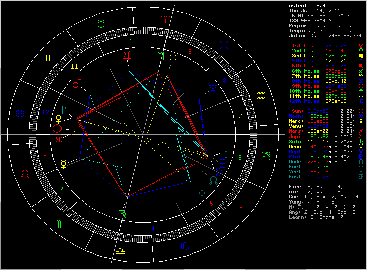 † 【占星】実践経験が重要なはず・・・ †先日、与えられた課題「なでしこJAPANの決勝戦」について、 従来の私の見方では事前に勝利の感触はあった。 事前の私は、色々考えあぐねたが、月が10H(11hサイン)の9h旧支配星である木星とアプリケーションをとること(それで月のディビリティが緩和しているように見える)。 逆に 土星には有効なアスペクトが無いこと。 (せいぜい木星に力を放出した後の月が スクエアで繋がるが・・・) 太陽と金星(コンバストだが)が ASCにある。 以上の点から、日本の勝利と判断した。 (実際には こんな簡潔ではなくて、色々試行錯誤してはいる。) さて今は、ウィリアム・リリーのテキストからはどう解くのかについて、考えている。 リリーのテキスト C.A では、スポーツの勝敗について見当たらないのだけど、 第51章 「戦闘、戦争、あるいは その他の争いについて」というのがある。 ASC支配星は ルミナリーズで、7H支配星は 凶星。 この点は日本有利だが、ディグニティでは 月のデトリメントもあり、土星は エグザルテーション。 微妙な情勢ではある。 法則では 「ASC支配星が7Hにあれば、勝利は 相手側」となっている。 しかし、7H内では無いとは言え、7HサインにASC支配星が入っているのに、 日本側の勝利となった。 また、結婚や売買のケースと同様に、月のアプリケーション・セパレーションでの役割分担があるが、これだとアメリカが有利の星となる。 こんな風に、部分部分では、こんな感じで、実際にはその法則が結果が合致しない点もある。 だからといって、テキストが誤っているというわけではないと思う。要は「使い方、読み解き方」なのだろう。 今回の場合、ASC支配星の背景には 土星があり、7H支配星の背景は ASCの金星で コンバストを受けている。 この部分でも、複雑な効果が出ているのかもしれない。 つまり、占星術の読み方というのは、外国語を学んでいるようなもので、 文法や単語だけでなく 実際の用例を経験しなければ、 その使いどころとか 取捨が 学べないんだと、改めて感じる。 だから占星術は、実際に占って、真摯に復習・研究をすることが肝要なことだと思う。 というか、やらなくちゃ上手にならないと思う。 それと同時に、ただ鵜呑みにするだけでなく、自分の読み方も重ねてみることも必要。 そうでなければ、自分のものにならない。 オリビア・バークレイの著書によれば、「フォーチュナ(POF)の無き ホラリーチャートは、ホラリーにあらず」とまで断言している。 (ウィリアムリリーや 他の大先生方も 使ってはいる。) しかし、私個人では 今まで POFを使わなければ 読み解けないケースには 遭遇した覚えが無いから、使っていない。 おそらく、大先生のバークレイの言うことの方が おそらく正しいのではあるんだろうけど。 これは、自分の力で実際に読んでみるということが重要なんだと思っているから。 それには 客観的に検証できる 失せ物探しや、社会的事件、スポーツなどを占ってみることが、 研鑽する道になるんだと思っている。 だけど、占星術書を出している某先生の本を読んだりサイトを見たりすると、実は あんまりホラリーが得意ではない 経験が少ない人なのかな?と素人ながら不安に思うんだよねぇ・・・。他の先生たちも 占例を披露したがりませんからね・・・。 ま、そもそも、シロウトの勝手な戯言ですけどね・・・。 この記事にコメントする
