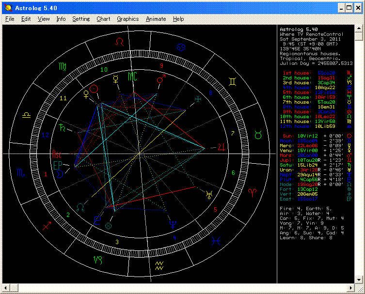† 【占星】 テレビのリモコンは何処? †先日、買ったばかりの液晶テレビ。 猫の世話をしているうちに 手にしていたリモコンが行方不明。 久しぶりの失せ物案件のため、勉強のため チャートを作成してみた。 ま、家の中にあるって判ってるんなら、星図を立てて 占うんじゃなくて 先に探せ!っていう話ですわな、普通・・・(^^) 状況・・・ リモコンを手にして 家で動いているときに、急に猫の世話をする事態になりました。 そのあと、テレビを見ようとしたら、リモコンが見つかりません。・・いったい、どこに在るのでしょうか? 今回は、質問者が直接的人物なので、(社会的事件犯罪よりか 私は)占いやすい。 失せ物の探す手段は およそ二通りある、 2H支配星を用いる方法と、象徴星や副支配星 月など 固有の星を用いる方法。 百合先生(リリーのことね)によると、「失った事物の表示星は 月である」となっているけども、 従来までの私は 2Hを用いて 大抵は 見つけてきている。 今回は どっちを用いる方が良いのか、使い分けを考え 有効性を確かめる 良い機会だと思った。 まず、従来の私流・・。 リモコンは 2Hが管轄する。支配星 木星は牡牛座にある。 木星が リモコンというのは一見 腑に落ちない気はした。小さくて、黒いリモコンが木星とな? ただ電波を飛ばす一方的な存在の射手座の性格の支配星なのだから、無いわけでもない。 木星は逆行、月はMRのアプリケーションで、ともにアングルにある。 リモコンは近くにあるし、見つかる。 月もフォールながらアングルMRで強いが、木星も負けずに強いので、木星を優先する。 木星は牡牛座、ディスポジターは 乙女座で コンバスト。 おそらく、地面の近く、何かと一緒に置かれていて、また何かに隠されている。 家の南側かな。経験上、布地的なものと一緒だろう。 実際、家の南側の地面近くを探していたところ、 テーブルの下の物陰に置かれていた 黒いコットン生地のバッグの上に、落ちていた。薄暗い場所で 黒いバッグに黒いリモコンだったため、見つかりにくかった。 あとから、気付くこと。 太陽は 金星の支配域にあるので、悪意的に隠れていなくて、包まれるような感じであった。 これは リセプションの効果かな、それとも木星がペリグリンになっていたせいかも。 乙女座が バッグの表示になっている。 コンバストの影響で、ディスポジターの金星の性格(色)は目立って出てきていない。 木星は、水星のターム、月のフェースにあって、これがリモコンの形状や性格を意味しているのかも。 ただ、ここからでは 黒色というのは出てこない。百合先生は「7Hは黒色である」と書いているので、これかもしれない。 これは後付で言えることで、もし色を当てろって言われたら難しいかも。 次に 百合先生の教科書を手本に追記・・・。 月は火星に接近。火星は 月の家の主星でもあるし、月を注視している。よって、事物は見つかる。 月は土星とセパレーションしており、置いた場所を忘れているか 無意識に置いてしまった意味。 月はオキシデンタルと同時に ASC近く。・・・これって、方角は 西になるのか?東になるのか? 現実に見つかった場所からして、月のあるサインの牡羊座の要素が どこにあるのか、さっぱり判らない。また、月の家の主星の蟹座の要素も関係性がわからない。 北側でもなければ、東側でもない。水は関係していない場所だし、部屋で火も使わない。 ただ、まったく関係無いわけでもなく、星図発起の若干 東側にあったし、お菓子とかが置いてある場所の近くでもあった。 だから、こっちから攻めた場合でも、まったく関係性が無いわけではないが、中途半端に使っていたら、家の北側の台所とか、見当違いな答えになるところであった。 ・・・・こういう不慣れな手法は 場合や手法によっては怖いところもあって、 中途半端のままで いきなり使うわけにはいかないね。。。 おまけ 木星は 逆行して、時間支配星 金星とのリセプションの名残があって、太陽へ接近。また ASC(とのアスペクト)にも近づいている。 この記事にコメントする