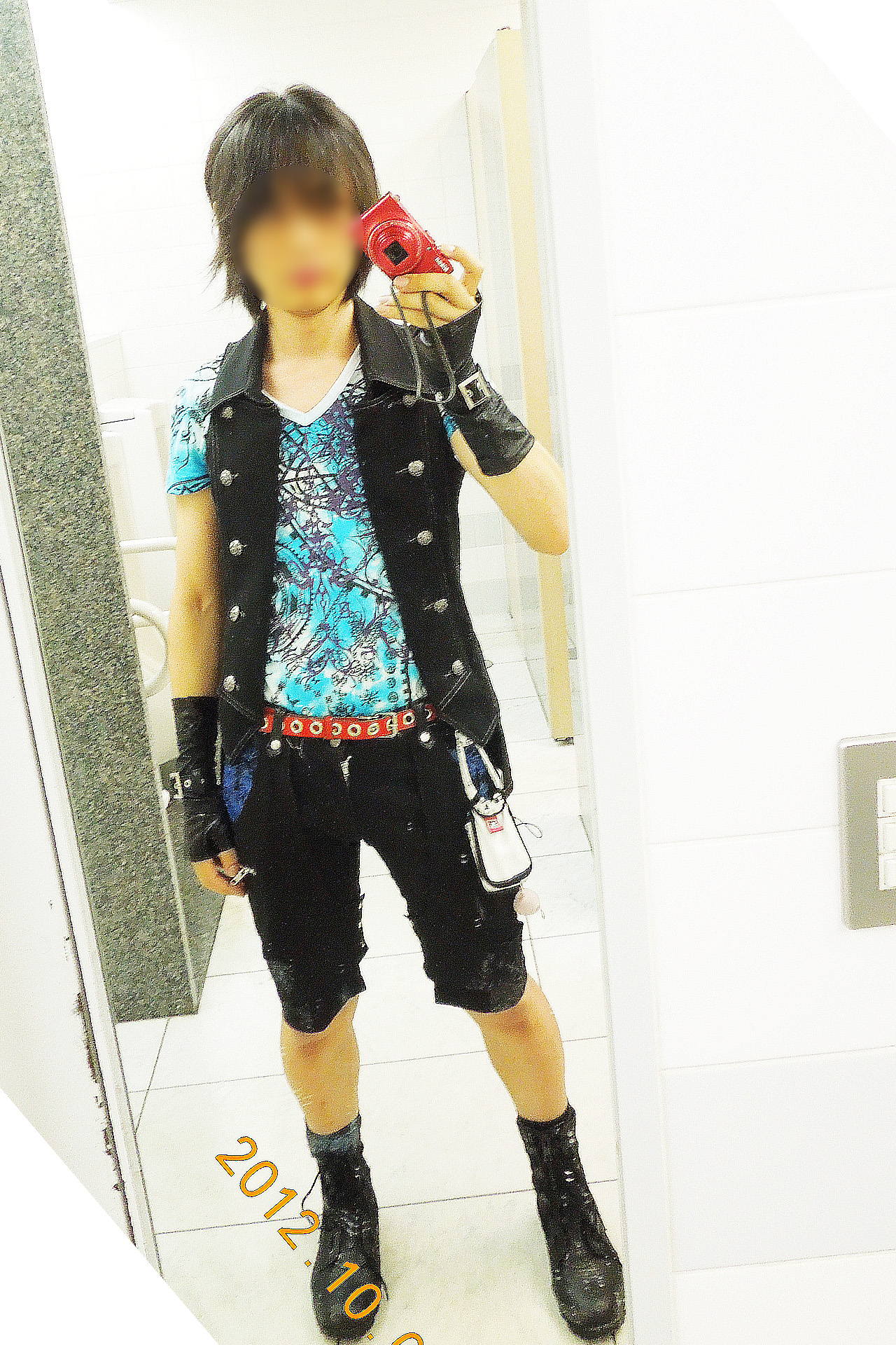† 空色に満天のモチーフと、青色のスノーブリザード †この日は、暑くなったので、涼しげな青色を使ってみた。 Algonquinsのナポレオンベストに、Sixhのカットソー(限定品のため名称不明)と、ダークブリザードハーフパンツ。 手には Sixh ヴァルサスナイトアームカバー。 カットソーは、新宿店からお迎えしたものです。 綺麗な空色が斑染めになっていて、そこに ごっちゃりと Sixhのモチーフが詰め込まれております。前面には ラメ入りの紫のプリントがドカンと入っております。 モチーフが あんまりにもゴチャ付いているから、買う前に見たときは 「なんかヤクザの刺青みたい」(←こらこら!)と好きになれなかったけど、店員さんのオススメもあったし、明るい色のアイテムがほしかったので、思い切って買ったんだけどさ。 こうして実際に合わせてみると、これは これで いいなぁ♪ と思った。 アームカバーは、写真では判りつらいけど、異素材の組み合わせになってます。 鑢掛けしたような くすんだ黒と、テラテラと濡れたエロい反射した黒との異素材アームカバーですにゃ。 ・・・しかし、暑い時季は どうしても カットソー&ハーフパンツ のパターンに陥りがちなところが、課題だなぁ。。。。