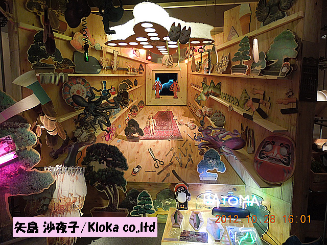 † ラフォーレミュージアム原宿「場と間/市場(Market)」 †あまりに早い時間に着いてしまったため、時間潰しに困った私。 新宿・原宿・渋谷ってな界隈の 時間潰しに良い場所を知らないもんで。 ラフォーレの6階で、何やらアートっぽいことの匂いがあったので、 戸惑いつつ 入場してみた。 しかし、案内の表示板が、、、 RECEPTION に BUISINESS に PRESS に ADMISSION に・・。 受付の横文字だけの案内に、若干 目眩を覚えた。 しかし、工業・商業のアートプロデューサーが、使用者・来訪者など人間への優しさに欠けた自慰行為では困るのだが。 とりあえず500円を払って入ってみた。 美術館でもそうだけど、一目みて通り過ぎる人が多いけど、私には そういう楽しみ方ができないなぁ。 私の場合、見応えのあるアートに出逢うと、10分~30分ぐらい 見続けてしまう。 他の人がそそくさと通り過ぎるってことは 混雑しないで済むから、私個人としては助かるけどね。 アート作品ってのは、一見 雑然としていたり、奇想天外だったりするけども、 その中には 製作過程の試行錯誤とか 製作者の意図とかコダワリとか、製作者の心象風景までもが込められている場合がよくある。 たとえば、これ。矢島沙夜子さんの作品。共通テーマは「場と間/市場(Market)」 芸術を解説するってのは野暮な話だけどね。本気でやると 読むのも億劫な長文になるので。 一点遠近法を 圧縮したような 構図。極端に表現することで、現実的には奥の狭い空間と 表現的な奥行き感の 食い違いが面白さを生んでいる。 ほとんどの物をダンボールの絵で 物品を表現している(天井から吊り下げられた電球も ダンボールで絵)。ダンボールの転写にすることで 非現実的な安っぽさを作り、作品全体を記号的に表現しようとしてます(簡単にいうと、写真や現物だと生々しいし、それらの存在感が 作品として 目障りになる)。 中央にポツンと 人間が居るのは、何の表現でしょうか。絨毯は居住空間の比喩ですね。 また絨毯は、人間の存在を色的に強調して 存在をアピールしています。 日常品と芸術品(装飾品)の対比、和的な事物と 洋的事物の対比を、作り出そうとしています。 お面・盆栽・だるまは 和的で装飾品、ハサミやフォークは洋的で、日常品。海産物は和洋どちらでもない自然の表現で 日常のものです。電球など工業製品もあります。 さて、右端に さまざまな人間の手のようなものがあります。実は、これ おそらく素焼きの手を転写したものですが、これは何の表現でしょうか。・・・職人の労働とか技術でしょうか。 (写真の右端には、替刃の棚がある) 右奥、ばらばらとお皿らしき物などが 色々落ちて 散乱していますね。 これは、どういう意味でしょうか? 長いマーケットの歴史には 東日本大震災などのように そういう災難などもあるということでしょう。 よく見ると、右奥の下のは 横たわった人間が居ますね。強調されていないし、横たわっています。 これで 死亡者を表現しているのかも。 奥というのは、この作品的には 未来を表現しています。 それは中央の最奥に、メトロポリスの映像が置かれていることからも そう言えます。 これには もう一つの見方もできます。 将来、人間が商品として並べられる時代が来るのではないか。 人間とはいえなくても、臓器移植など、人体を商品として扱う時代が。 横たえているというのは、死んでいることを表現しているとも言えます。 中央のメトロポリスの映像の額に、何故 エビが置かれてるんでしょうか。 まるでお正月のようです。これは、おそらく 今の時代の人が願った「未来への希望」と「 新たな時代の歓迎」の表現でしょうか。 しかし、実際には バラ色とは言い難い未来(メトロポリスの映像)です。 さて、中央の上にある手は何の表現でしょうか。まるで天上から未来の映像(メトロポリス)を人間に見せ付けているようです。・・・これは神の手かもしれませんね。 ・・・書こうと思えば もっと色々あるのだけど、言いたいのは「芸術には、色々見るポイントがあるんだよ」ってことですね。 製作者にはコダワリがあって、些細な事物であっても 何気なく置いているように見えても、考えやヒラメキを伴って そこに置いています。 そういうことを想像したり推理したり、考えながら楽しみだすと、芸術鑑賞って時間が経ってしまうんですね。 まぁ、、、アート展示は入り口の付近だけで、あとはアート作品の市場的な世界の中での即売会ですね。 売り手との人付き合いが苦手なのと、大概があまりにも高額な値段だったりするので、そそくさと退出しました。 この記事にコメントする
