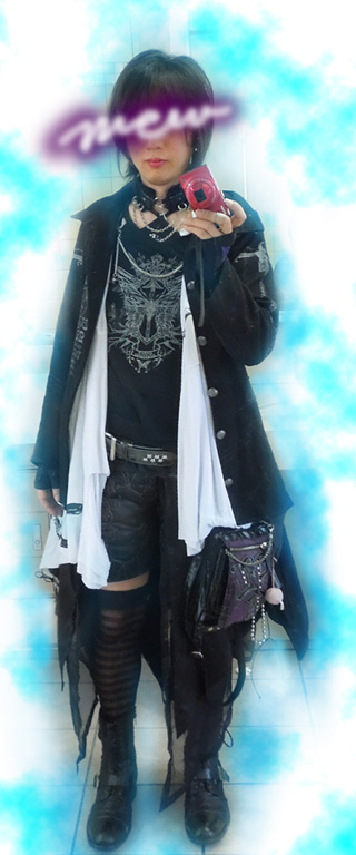 今回、デッドストック状態のアイテムがワラワラと陽の目を見た! 普通は使い切れないアイテムばかりの組み合わせだから、 今回、私にしては珍しいコーデになっておる。 は、は、はははははっ、初公開のスカート仕様なのだ!!! でも、せっかくのスカートってのがこの写真じゃ判りづれぇなぁ。 これは正面だけカパッと開いているオーバースカートで、ショートパンツが見えているところ。 横とか後ろからだと、シェイプ(姿)が コートとスカートになってるんだよ。 写真では わざと白のカーディガンを露出させているけど、普通状態だと こんなに出てないで コートに隠れてます。だから実際には コートの下を白く縁取る感じになって、もっと黒々してます。 Anarchyのコートなんか、何年前のやつか判らん。 腕に骸骨の十字架がでっかくプリントされているっていうことで、 今回は大抜擢されたのだった。 しかし、下半身の選択を誤った。 タイツにすれば良いものを、ニーハイソックスにしたがために、 この季節、絶対領域が秋風スースーで寒いよー! 初めて、新作発表&受注会なんて参加したので、戸惑う私であった。 しかし、、、こういうのに参加するとさ、買わないと帰れないっちゅうか、 やっぱ欲しくなっちゃうし、だから買っちゃうし。 私が似合わないであろう、グロゴスカワイイ服を、一式買っちまったよ。 着ないであろう グロガスカワイイ服を、ンまん円 買っちまった。 なんか、毎月 このお店に来るようになっているのが、チョと怖い。 ヤバいよ、ヤバいよぉ~。 この記事にコメントする