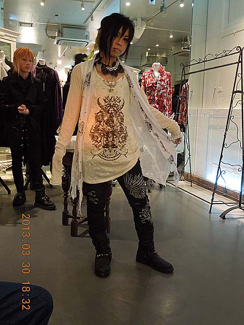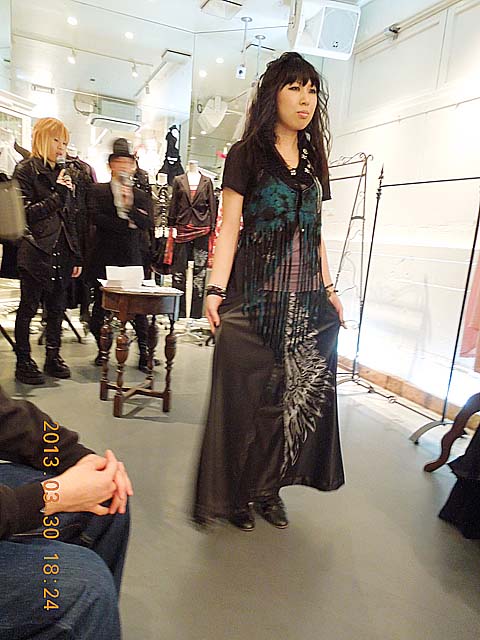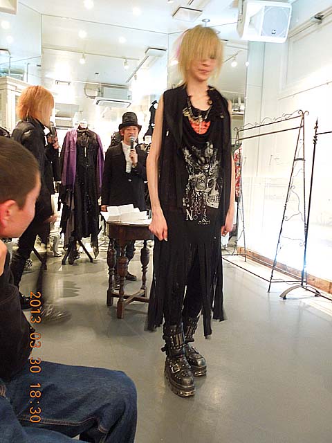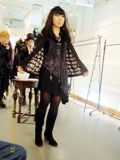 † The variegated collars・・・(3) 邪気で寄せ付けないミューの巻 †こういうイベントのときは 一般的に それ独特のコーデの人たちが揃ったりするのですが、 今回は そういう方は 半分くらいで、あとは カジュアルっぽい方とか多かった。 SEVEN系って 或る意味 普通っぽい方だからかな。 2部開催だったこともあって、人数的に ゆったりとしていたのは嬉しい。 で、なぜか私の隣には 誰も座ろうとしないという、、、私は邪気でも放っていたのだろうか。 今回、写真撮影も良いということだったので、あとで写真を幾つか出してみます。 さて、 でも、フェミニンなフォルムだと、私には あんまり使いどころが無いようなので、パス。 FRILL とか GRAMM とか、 そういうときには合いそうだなぁ・・と思う。 ショーの写真(一部抜粋)今回は、新作発表会というよりか、デザイナー自らが語る コーディネイトの提案 という趣旨だそうです。 これからの新作というだけでなく、既に発売されているアイテムなども使われてますね。それに加えて、新作の 襟飾り を使って コーデしています。 写真をよくみると、胸前に襟飾り(首飾り)も使われているのが判ります。 写真で言い訳させてもらうと、ストロボを使わないようにしていたので、露光時間が延びて ブレボケが起きてしまってます。あと、写真と逆方向のお客さんが写真に必死な方で、撮影で突き出す肘やら膝やら後頭部が邪魔になっていて、逆側の方では なかなかシャッターチャンスが無くて・・・(T_T) このSEVEN系(パンク・モード系?)ってのは、あまり馴染みが無いからかな。 瞬時に「欲しい」という感覚は湧きませんでした。 店員さんに色々 お話していただきましたけど、「どれか気に成っているもの ありましたか?」と言われて、困ってしまいました。 気に成るとすれば、、DarkRedRumのがカッコ良すぎてなぁ。 奇抜 過ぎて(袖が異様に長いのとか)、着るのに不安になるん駄菓子菓子。(←どこのブログだ?) このあちこちの拘束ベルト! 肩のチラ見え編み上げ! これにアシメスカートを合わせたのなら、 私の官能ポイント 突きまくりんぐ!(←だから、どこのブログだっつうの) ラックにこいつが 何着も合ったのを確認したけど、その中から 2~3着は嫁いでいったっぽい。 店員の方々には、結界を破る魔力があるようで、 ナリさんにもテルさんにもエビさんにも、みんなに優しく対応していただきましたよ。 この記事にコメントする