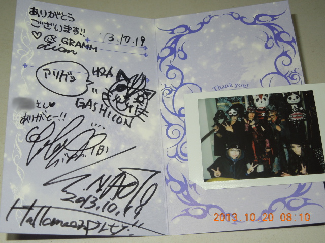 † Halloween Party 2013 @ +原宿店 †この日は、なんとか有給休暇が取れて、朝からイベントに行く準備してたんだけど、 問題は どうしても 着ていく服が 全く 決まっていない、決まらなぁ~い!ということだ。 「仮装してきてくださいね」って ハードル高くないか? もう このままでは遅刻してしまふ~! だが、私は既に最終兵器を実は入手してあるのだ。 それを付けると たちまち仮装になってしまうという必殺武器を。 だから、取り合えずは、普通じゃないコーデにすればいいか。 でも今回のハロウィン特別仕様は、さすがにデーハー過ぎるので、地方都市で歩くのはちょっと危険。 だってさぁ、実際には ハロウィンって10月31日じゃんか、しかも 日本では ハロウィンなんて認知度低いじゃん。 ただの危険人物とかになりかねないよね。。。この問題については、Sixhのツナギで全身を覆ってしまうという作戦で乗り越えた。 h.naoto+原宿店には時間前に無事に到着。時間がまだ有ったので、先に買い物。 IBIさんの接客を受けるのは、ちょっと久しぶりかも。IBIさん、悪の大佐(軍人)の仮装でした。 その店内に ボロボロの服に 鼻メガネのゾンビ が ガタガタと異様に動いていた人がいた。 それが 廣岡さんでした。サービス精神すごいです。 首には本格的な猿轡らしきもの・・・が付けてあったので、 「首のこれ、ギャグですか?」と聞いたら、「いえ、ダークレッドラムです」と返答されてしまった・・・。 廣岡さん、私、貶したわけじゃないの。猿轡のこと、英語で 「gag」 っていうんよ。 あまりにマニアック過ぎて 誤解させちゃったかも。 ・・・でも、 廣岡さんが、SMマニアで無いことは判ったぞ!(知ってどうする?!) 17時となり、+原宿店 2階への扉が開かれた。 Z8さんは、死体の紳士かな。 シルクハットに 蒼白い顔に目の下 クマー。 ガシコンさんは、猫耳フードのケープにミニスカ。そのウエストが細さにビックリ! でも、メガネは外さない! そこはブレないのね。 始めは、Hangry&Angryのイラスト間違い探し。挙手制でしたが、難易度が高くなかったので、すぐに終了。 次に、絵の伝達ゲーム。10人制で、5秒の間に前の人の絵を見て、10秒以内に次の人のために絵を描く。 古典的なゲームだけど、結構 楽しいです。だんだん盛り上がっていきます。 IBIさんの、愛の風船 バレーリレー。2階を目一杯使って、参加者全員で沢山の風船を、逸早く IBIさんの元に届けるというゲーム。 いつのまにか、風船のことを「オッパイ」言われとりました。「オッパイがいっぱい」。 ・・・確かに 風船の端っこがオッパイの乳頭みたいだったけども・・・。(^^; その後、○×クイズ。 「IBIさんは暑がりではない?」「h.naotoの h は、廣岡のhである?」・・・いやいや、それでは難易度低くて、落伍者が出ませんから。 そこで、難易度が急上昇。「GRAMMのハナちゃんは、目が無い?」・・・たしか有ったはず。目のところにボタンが付いていたよねぇ。 でも、誰も○から×に動こうとしないので、私も躊躇したら、やっぱり 「目が有る」で、全員 不正解。 あぁ、次からは 素直に思った通りにしようと思った。 出題仕切り直し、「Hangry&Angryのハングリーちゃんの誕生日は 6月6日である?」・・・ たしか、そうだったような。ここは、ハングリー押しメンの私は 勇気を出して ○に移動! しかし、誰も追随しないで、私以外は 全員 ×のまま。 あっけなく 私が正解で終了。ちょっと居心地が微妙~。 ・・・ま、私のハンちゃん愛が証明されたということで。 その後、全員で投票していた 仮装コンテストの結果発表! これは オフィシャルの報告を見てくれい。でも、他にも メイクとか 凝っていた人、いましたよ~。 参加者全員が写っているような大型の写真も出るといいですね。 そうしてハロウィンイベントはひとまず終了。 デザイナーさんたち揃っての チェキ撮影会へ移行。 私にとっては、Z8さんのは 初めてかも? 先に買い物を済ませていた私は、結構 早めに撮影しました。 デザイナー全員のサイン入りということで、一人ひとりにちょっと時間が要したので、 早めに買い物をしておいて良かったです。 なお、私の姿は、オフィシャルの写真では ほとんど(というか全く)写っておらず、おそらくここでしか見られないです。何しろ後ろで静かにしてたからなぁ… (-Д-; …というわけで、このチェキが 唯一 参加した証明でございます。 閉店時間までは まだ時間がありましたが、1階が混雑している(みんなは 買い物&デザイナー歓談?)ので、早めに 失礼することにしました。 …とお店を出て 大変なことに気づいた。 服装が イベント仕様のまま! うわうわ、どうしよう。どっかで 早く 着替えたい! 表参道では「あれ、凄ごぉい!」とか言われたり、いきなり真正面からフラッシュを浴びるし。(ひえぇぇぇ~) ・・・あぁ、原宿駅のトイレは 行列になっているしぃ~、こんな照明が明るいとこで みんなと並んでいたら、まるで晒し者じゃないか。 そのトイレは諦めて、
