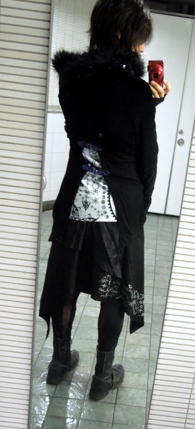 今回は、紫色をテーマにしてみました。 当初の予定は レギンスでは無くて、ロングパンツにオーバースカートのつもりでいたんです。 でもさ、私には なんか普通のボトム(パンツ)がなかなか合わないんだよねぇ。 あまり持ち合わせが少なくて、合わせるアイテムが見つからなくて、結果 レギンスを選択。 レギンスにスカートになっちゃったから、想定外のフェミニンなコーデになっちゃった。 前面には 紫ラメの エンドオブハートカットソーが見えますが、その中に レイヤー(兼 防寒)として 薄紫色の ビクトリアドーンタンク を着こんでいて、近づくとわずかに 縁取るように レイヤーとなって オシャレ~って感じです。 後ろはこんな感じ。カットソーの背中側が凝っているので、それを見せたくて ショート丈のパーカにしました。んが、このパーカが ファー付きフードが重くて 後ろにずれ落ちるのが困りもの。 会うたびに、IBIさんに、ゆざーさんに、位置を直して頂いてしまいました。 このパーカ、見ると どうしても位置を正さなくては気が済まなくなるという魔法のパーカのようです。 この記事にコメントする