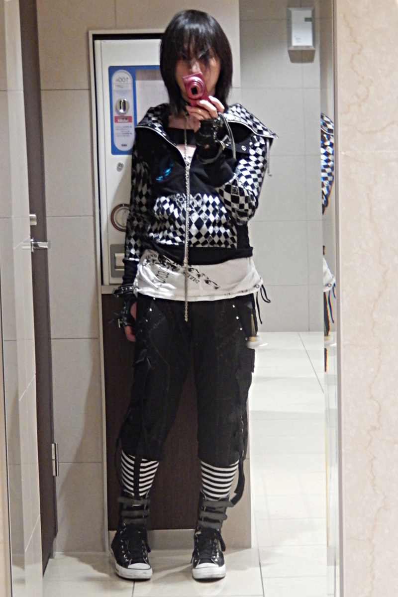 過去のSixhイベントでの IBIさんファンの姿が目に浮かんできた。 そして この未来、もしかしたら 遠くから Sixhシルバーをゲットしに来ながら、売切れでガッカリする状況が思い浮かんだ。 私はアクセ使いが苦手で、購入しても なかなか使いこなせないかもしれない。 それなら、ここは お店に留めておいた方がイイよね。 せっかくだから、好きな人に…などと、青臭いことを考えて、断念(ってほどじゃないけど)しました。 このあと、山手線と総武線を乗り継いで、高円寺にも行ってきました。 ただ、うちから 高円寺は 行き辛い…。最低 4つの交通機関を乗継ぐ道のりだもんなぁ。 ちょっと失敗コーデオフィシャルな着方をしない私なので、結構 失敗しているけど、 今回は ボツにしたいくらいだけど、元々のアイテムが良いので、その紹介のために出すよ。 前回は Sixh/NiNE の毒気多めだったし、次回も バリバリのSixh/NiNE にする予定なので、 今回はSixhで カジュアル的なコーデを作ってみたつもりだった。 上が、NiNE.ディバイディングパーカ、下はSixhのデモンズハーフカーゴパンツ。 この上着の NiNE. ディバイディングパーカ。普通のパーカーのようでして、なかなかカワイイ代物なんだ。 なぜか 売切れが多いようで、とくに 黒/銀 バージョンは、Webshopでも早速 売切れている。 でも正直、何で、売切れなのか、判らない。 私は 写真で見たときは、普通のパーカに見えて、さほど惹かれなかったし。 コレクション写真とかKERAで紹介されているわけでも無かったと思うんだけどな。 元々の生産数が少ないのかなぁ? まず 伸縮する厚手の生地で、細め 小さ目に出来ている。 だから、微妙に体のラインが出るので、ちょっとしたセクシーさが出るんだよ。 今回、私の何が失敗って、このパーカの良さを殺すようなカットソーの着方だ。 これ、カットソーを出さずに、プロポーションの良い人がこれでミニスカを穿けば、絶対に素敵な感じになるはずだよ。 あと、この写真では判りにくいけど、ジッパーを上まで引き揚げて、両襟をボタンで閉じると、タートルネックみたいに首が隠れる。 お店で試着してみるまでは、その良さがよく理解できなかった。 柄物が苦手な私だけど、このパーカの柄具合、なかなかカッコイイなと思った次第。 この記事にコメントする