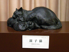 † やっと辿り着いた松濤美術館「ねこ・猫・ネコ」展 †一旦、原宿に寄って、気になった品物を購入してから、遅い昼食。そのあと、すぐに渋谷に向かいました。 しかし、目的地が一向に見つからない。 渋谷で通ったことのない場所に行ったこともあるけど、タブレットPCが使い物にならなかったのも原因だった。(スマホじゃないので) モバイルルーターを姉に強奪されてしまったために、地図とか調べようにも タブレットPCが繋がらないんです。望みをつないだ渋谷駅周辺だというのに、満足なWi-Fiスポットも無いんですね。 暑い日で、下したてのブーツで、あちこち歩き回ったために、靴擦れが酷くなっちゃったよ。 まさか 宇田川町のNHK本社屋に遭遇するとは。 諦めて 渋谷駅に戻ろうとしていた時に、やっと発見しましたよ。 松濤美術館です。 この近くに、立派な豪邸の高級住宅地があるんですが、 私は道に迷って、その豪邸の地区の方から来たため、これも豪邸の一軒と思いそうになりましたよ。 とにかく、初めての私には ちょっと判りづらい場所でした。 展示内容は 猫の美術品の企画展。NHKの日曜美術館を見ていて知ったのですが、 原宿のキャットストリートの近くとかにも、この松濤美術館の猫企画展示の告知が貼り出されていたところをみると、 今回 よほど集客に力を入れているようですね。 まぁ、美術というものにあまり関心の無い方には、こういう「猫」という一般的に人気のありそうな企画は訴求力はあるんでしょうね。 こういうことも必要だとは思います。 私が興味を持った作品作家を一人挙げるとすれば・・・。 朝倉文夫の塑像ですね。この人の作品はどれも良かったのだけれども、 とくに、「よく獲たり」という 捕まえたばかりのネズミを咥えている猫の作品。 この人の作品の特徴は、猫の動態を見事に捉えている点です。 この作家は、ネコ好きで 猫をたくさん飼っていたらしいのですが、 だからこそ、その場面の切り取り方が素晴らしいです。 とかく表現とか手法とか流派に囚われることが多いですが、 そもそも その場面を見事に切り取る・・というのは、芸術家には 重要なことです。 この作品、鼠を咥えた猫の不安定な姿勢からは、「何か 決定的な瞬間と捉えた!」という感がにじみ出てきます。 あと、猫の眼の造形です。 一見 全体は塑像のゴツゴツ感で雑さを感じるのだけれども、眼の部分は 心血を注いだような繊細さがあります。 瞳孔を描いているわけではないのに、その眼差しの視線が見えるようです。 これは 実物を間近で見ないと判らないと思います。 猫がネズミを捉えて咥えている時って、捉えた鼠そのものよりも 何かその遠くを見ているようなときがあります。 この塑像はまさに その時の猫の目なんですね。 鼠を捉えた興奮がまだ醒めきれない猫の姿って感じです。 あと、鼠の薄い皮膚の表情が良いですね。 猫に咥えられて、引っ張られる薄い皮膚には、生き物の皮膚と骨格と内臓が見えてきそうです。 この人の作品、もう一つ、「親子猫」という作品もあります。 この3匹の子猫が どこがどうなっているのか判らないくらいに 一塊になって、 それが親猫の中から垣間見えるのが、良いですね。 写真では2匹に見えるけど、実際には3匹なんです。 真ん中の子猫は 向こう側で顔を出しているんですよ。 この朝倉文雄の美術館が 東京都台東区にあるらしいので、機会があれば そこにも行ってみたいと思います。 私は猫好きだけど、この企画展で猫を集めたから良かった・・という感想は持たないですね。 むしろ、その表現とかに楽しみを見出すタイプなので。 あと、竹内栖鳳の「酔興」とか、岡本一平の「漱石先生」は、洒脱で面白かったです。 あと、猫とか関係なしに 牧尾邦夫の「白い憂羅」の女性の裸体の色が凄かったな。 太陽の自然光による黄色みを帯びた表色と、部屋の照り返しの緑を帯びた裏色の織りなす 精緻な描写の女性の裸体には、 ずっと惹き込まれました。 この記事にコメントする